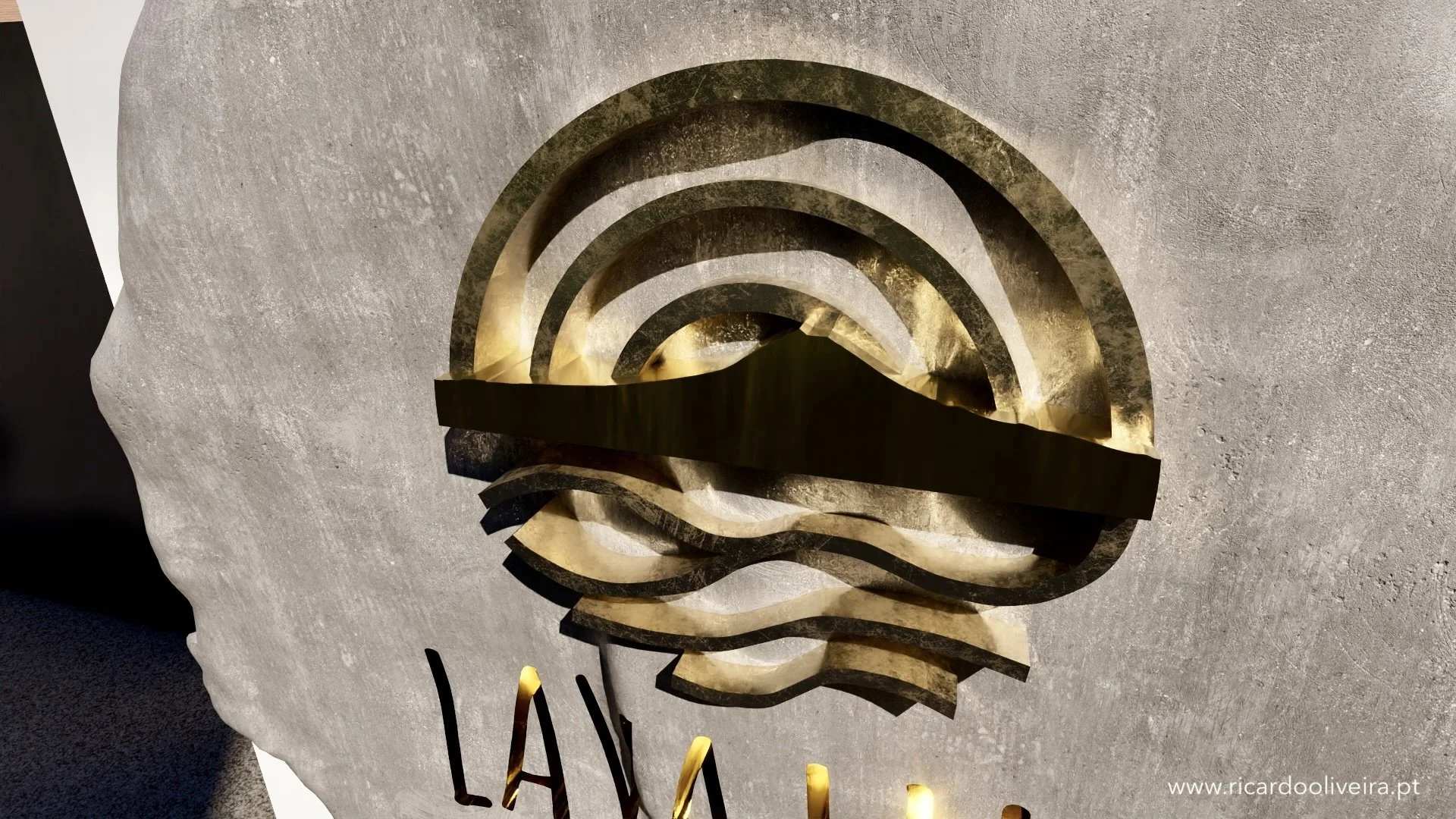 Base em pedra rústica: A textura da pedra onde o logotipo está inserido remete diretamente para a origem vulcânica da ilha e para a autenticidade dos materiais locais, como a pedra basáltica, muito característica da paisagem do Pico.